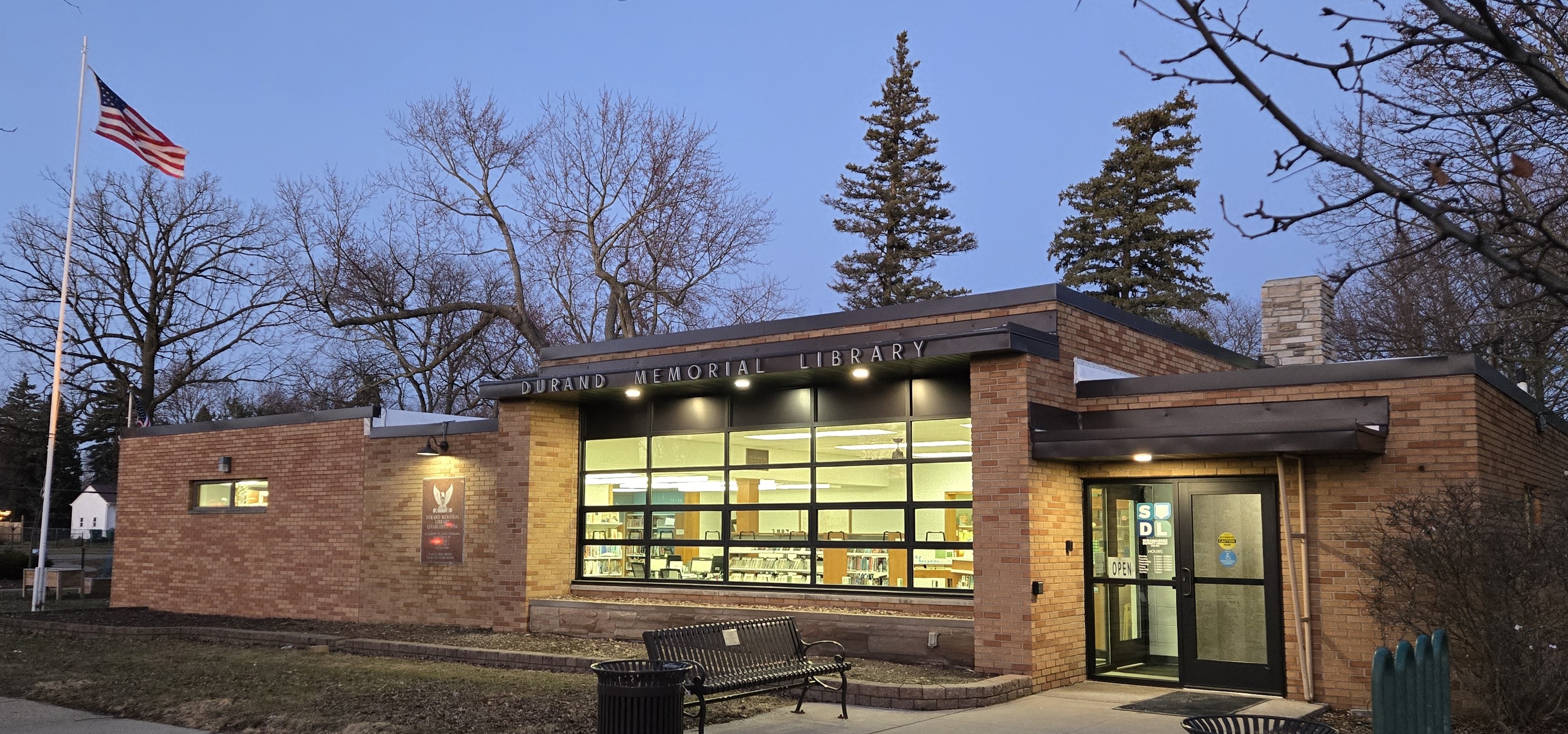 The Durand Memorial Library opened its doors in March of 1954 after years of community efforts to raise money for construction. Area schoolchildren even participated by selling paper bricks for $1.00 each. Most of the library’s original furnishings were locally handcrafted and donated.