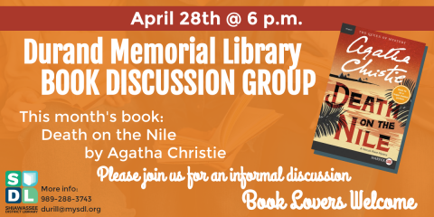 Book lovers are welcome to join us for a discussion of the classic Agatha Christie mystery "Death on the Nile".