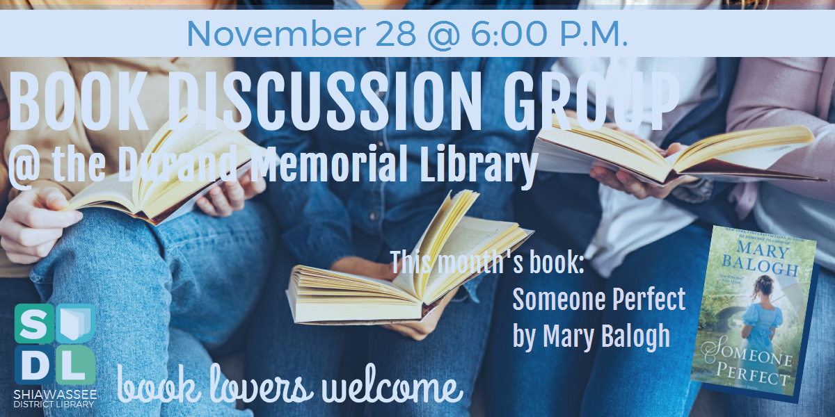 Book lovers are welcome to join us for an informal discussion of Mary Balogh's Regency era romance "Someone Perfect".