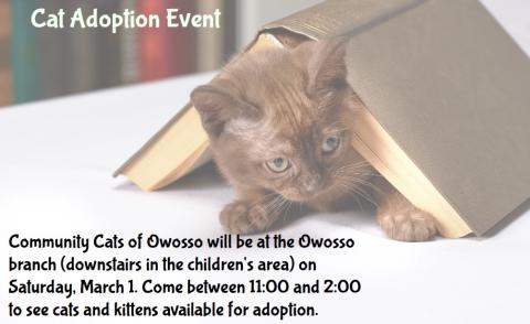 Community Cats of Owosso will be in the lower level of the library with cats and kittens ready for adoption. Bring the family and meet them....maybe you'll take one home!