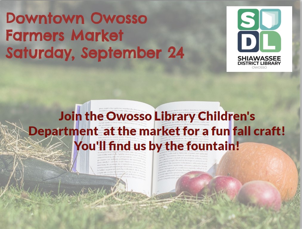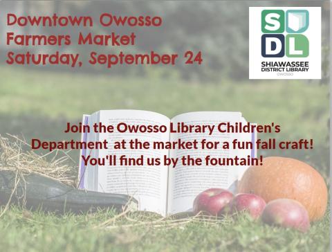 Stop by the Library table near the fountain and enjoy a special fall-themed activity with the staff of the Owosso Library Children's department.