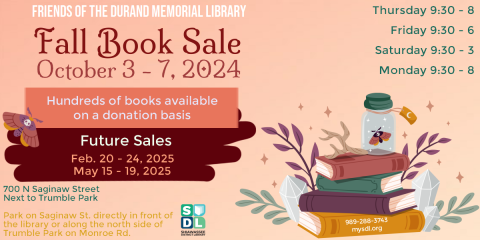 Help support our Friends of the Library and find great books at our annual fall used book sale. Books are available for all ages and sorted to make shopping easier. DVDs and audio books will be included in the sale.