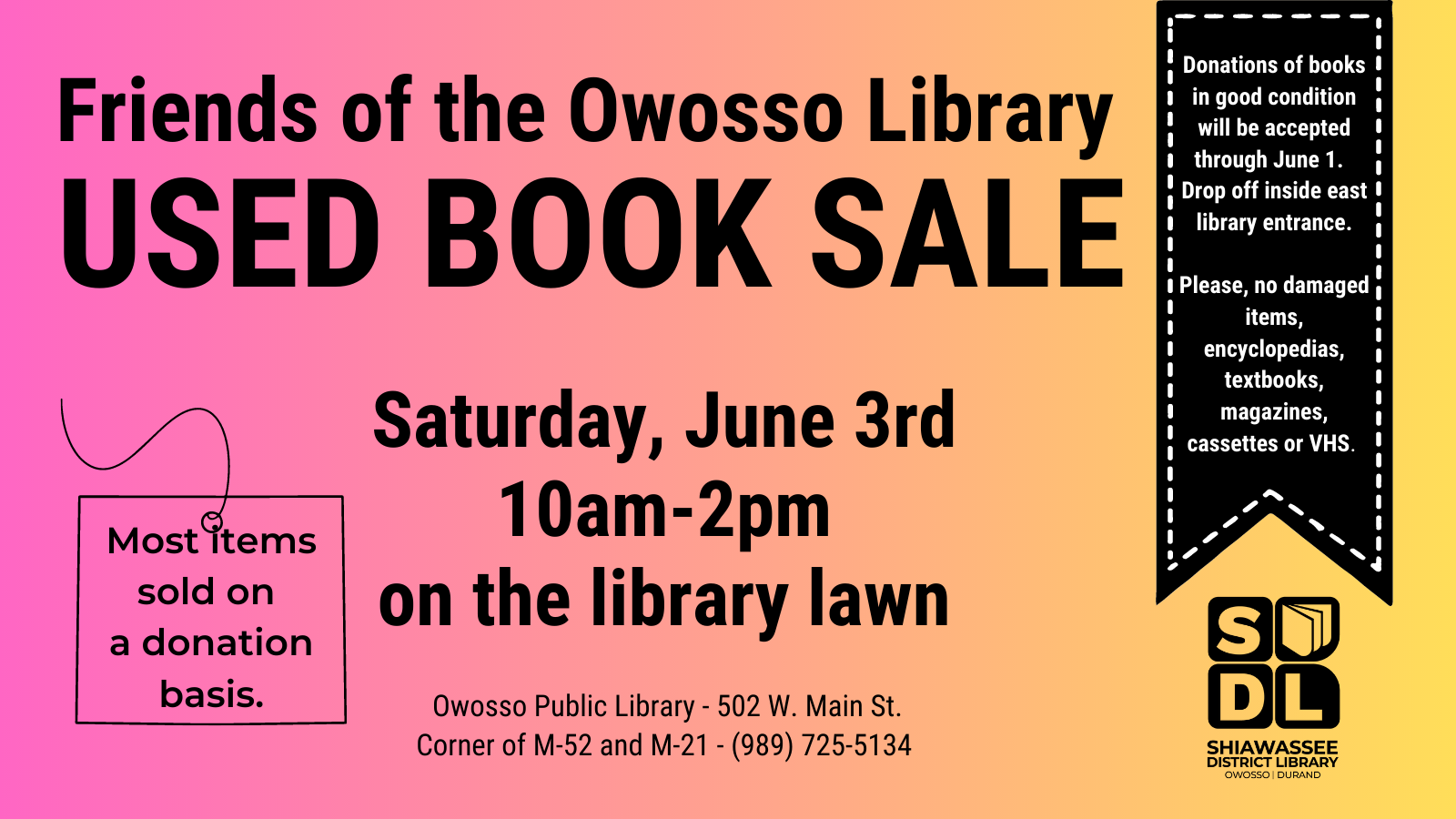 Donations of items for the sale are being accepted until June 1st. Drop off during normal library hours on the bench located inside the entrance on the east side (M-52) of the building. Please only items in good condition. No textbooks, moldy or damaged items, VHS, encyclopedias or magazines.