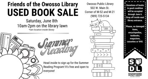 Donations in good condition accepted at the Owosso library in the east entryway through June 6th. Please, no encyclopedias, VHS, magazines, or textbooks. Do not leave donations in the library book return.