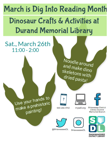 Children are invited to make a dinosaur skeleton out of pasta and paint a dinosaur picture. Be prepared-painting project will be messy!