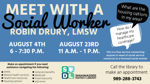 Robin will meet with individuals to help them navigate social services such as Medicare, housing insecurity, Veteran's benefits and more.  She can also assist with completing the Michigan Home Heating Credit.  This is a free, confidential service.  Please call to set up an appointment time:  989-288-3743.