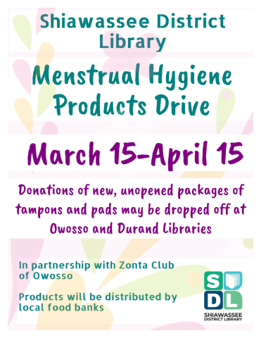 Both Owosso and Durand libraries are collecting donations of new, unopened menstrual products. If you wish to donate, stop in during regular library hours.