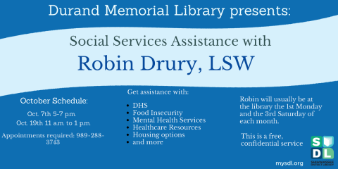 Licensed Social Worker Robin Drury will help individuals in need of social services including Medicaid, DHS, housing, and more. This program is free and confidential. To make an appointment: 989-288-3743
