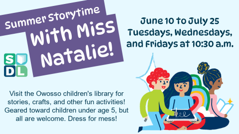 Visit the Owosso children's library for stories, crafts, and other fun activities! Geared toward children under age 5, but all are welcome. Dress for mess!