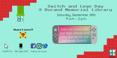 Primary tabs Upcoming List Month Week Day Remind Me Add To My Calendar Print Share Program Type: Other Age Group: Children Please note you are looking at an event that has already happened. Program Description Event Details Children and families are invited to drop in to play the Nintendo Switch or build with our Legos.