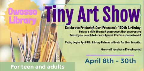 Visit the library to view the completed works of tiny art submitted by library users and vote on your favorite. The artist with the most votes will win a Frieseke print.